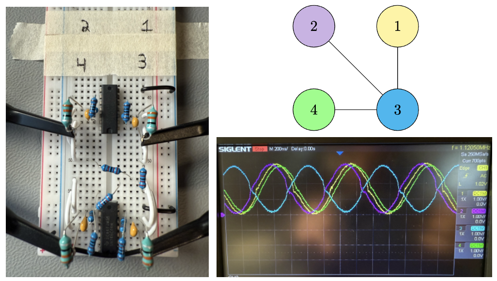 This principle can be demonstrated with a simple breadboard experiment. In this example, 10K ohm resistors connect the variable $x_3$ (blue) to $x_1$ (yellow), $x_2$ (purple), and $x_4$ (green) which themselves share no connections. No injection locking is used for this small experiment. Probes measure the voltage waveform at the inductor at each oscillator. The oscilloscope shows the set of variables $\{x_1, x_2, x_4\}$ are mis-aligned with $\{x_3\}$, which indicates the optimal solution $x^{*} = [1 1 0 1]$ or equivalently $x^{*}=[0 0 1 0]$. In context of the MaxCut problem, this corresponds to “cutting all the resistors” which is the optimal partition for this graph. The oscillators perform the computation “for free”.