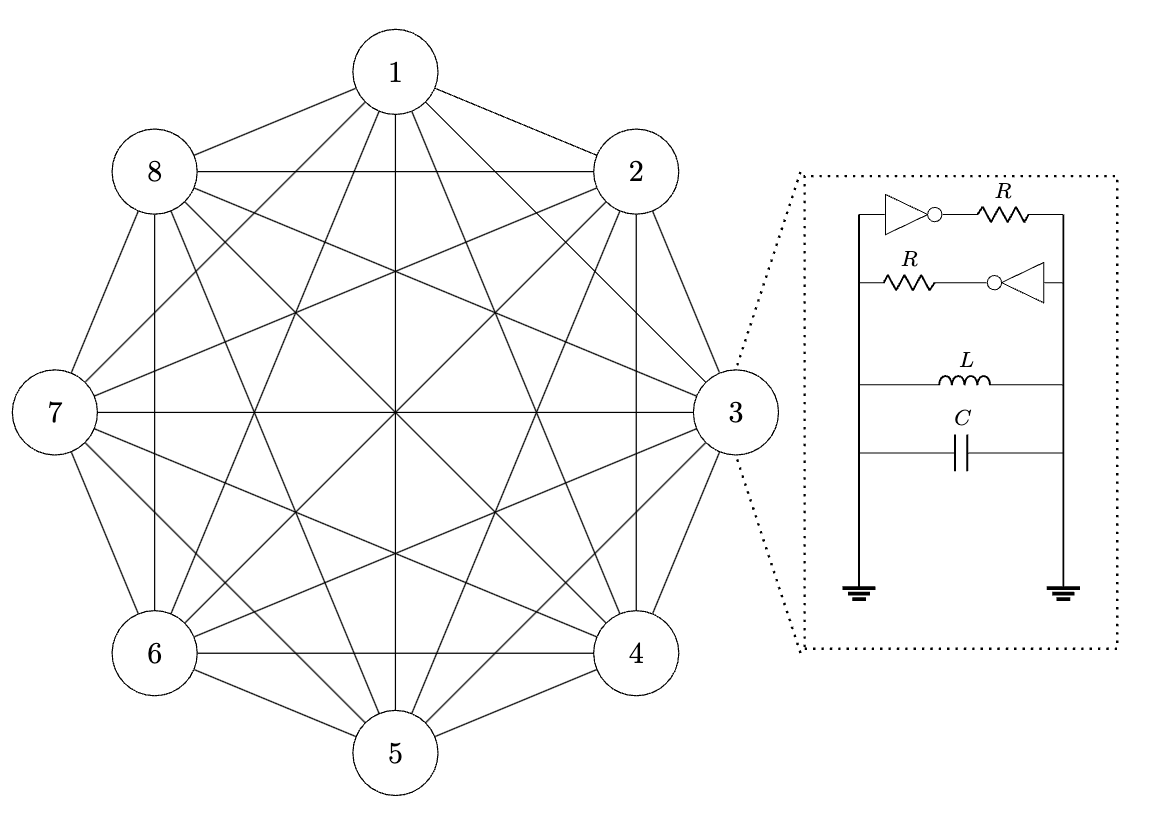 The circuit contains 8 LC oscillators (top board) connected through a programmable resistive network (bottom board). The system is a fully-connected graph, where each node is a LC oscillator, and each edge is a tunable resistor. The phase of each oscillator $\theta_i$ responds to the binary variable $x_{i}$. The ESP32 microcontroller sets the resistive couplings between each oscillator to encode the matrix $\mathbf{J}$ that defines the problem. The oscillators will then stabilize to phase configurations that minimize \begin{equation} H(x) = x^{T}\mathbf{J}x \end{equation} This quadratic optimization is generally NP-Hard and represents a board class of problems. The weighted Kuramoto model admits an equivalent Lyapunov function, meaning the natural phase dynamics can be exploited to minimize $(1)$. In fact, these dynamics actually implement continuous-time Lagrange multiplier optimization. However, in our case, we must ensure the phases settle to binary (0 or $\pi$) values instead of continuous ones. To do this, an external perturbation signal at twice the oscillation frequency is used to create bi-stable modes, a technique known as subharmoic injection locking. The amplitude can be varied over time, which effectively performs annealing to gradually enforce bi-stability. This is required because not all stable phase configurations represent the global minimum of $(1)$.